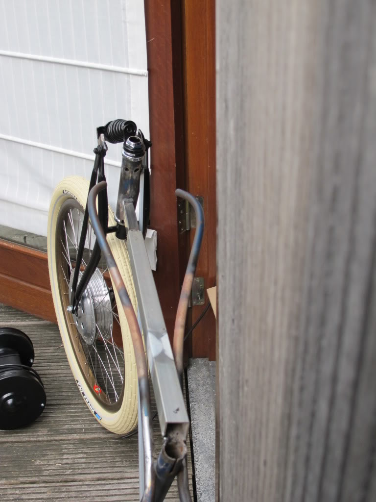 I then extended the top tubes and re-used the old downtube. Bent a 26mm gas pipe for the new downtube. The bends are a bit rough but ok.