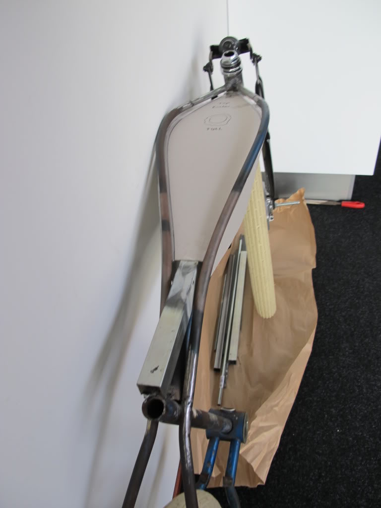 I then extended the top tubes and re-used the old downtube. Bent a 26mm gas pipe for the new downtube. The bends are a bit rough but ok.